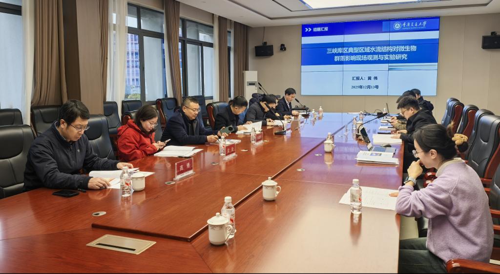 2025年12月13日上午10点,“三峡库区典型区域水流结构对微生物群落影响现场观测与实验研究”项目验收会在我校科学城校区西科所召开。验收会专家组由水利部三峡工程管理司原司长罗元华、重庆市水利局科技处处长兰朝阳、四川大学张建民研究员、湖南大学梁婕教授、中国科学院重庆绿色智能技术研究院鲁伦慧副研究员组成。重庆交通大学重庆西南水运工程科学研究所所长袁浩研究员、河流与灾害中心副主任胡瑞昌,河海学院孙倩副教授、毛云飞讲师、黄伟助理研究员,以及硕士研究生等人全程参与交流。会议由中国水利水电科学研究院全国重点实验室副主任黄伟研究员主持,罗元华司长担任组长。
